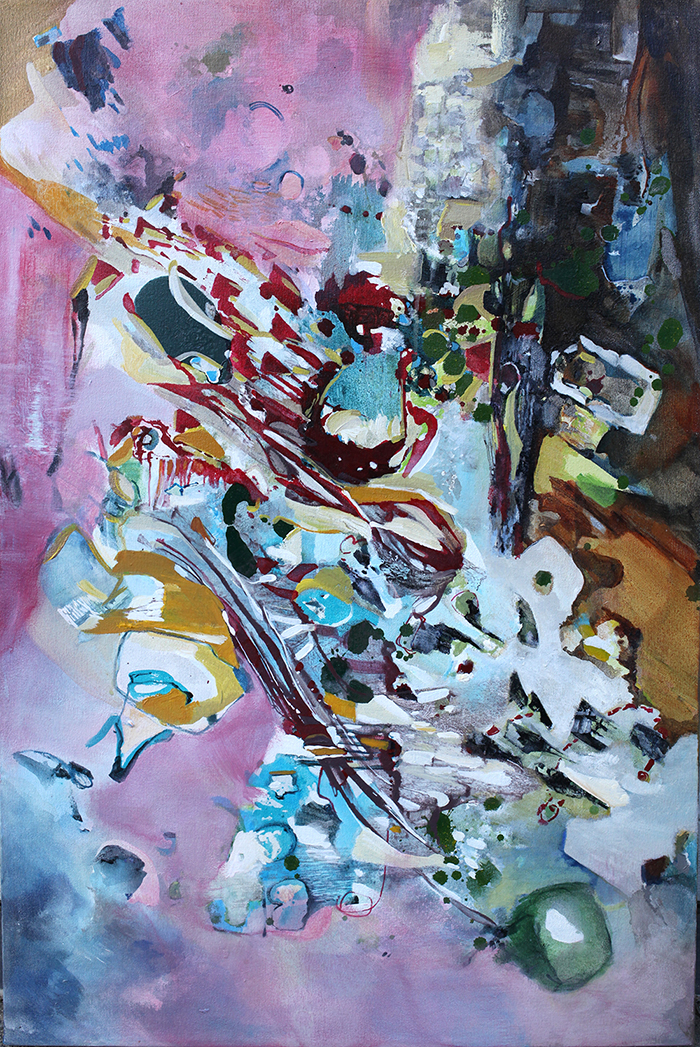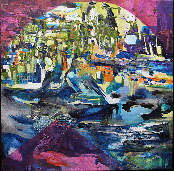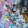 This is an abstract painting with horizons on the vertical and horizontal planes. A hot colour scheme interweaving ultramarine blue, creating a trellis. It is a dense composition with many layers of urban figurative elements woven behind a sky landscape.